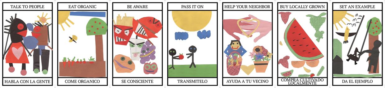 Created by 2nd graders and their teenage buddies, these bilingual, visually stimulating Food Justice Cards capture student learning about the inequities that exist in our food system and information to inspire change. The students created the cards under the guidance of their teachers in collaboration with local artist and activist Kim Abeles.