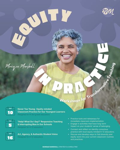 Monique Marshall Strategy & Consulting is proud to present a bundle of 3 workshops designed and delivered by founder Monique Marshall for educators looking to develop and deepen their classroom practice, boost student engagement, and create meaningful spaces of belonging for all youth in K-12 classrooms. Come join this collective learning journey with other committed educators. When you participate in any and/or all of these workshops designed specifically for groups no larger than 20 educators, you will…